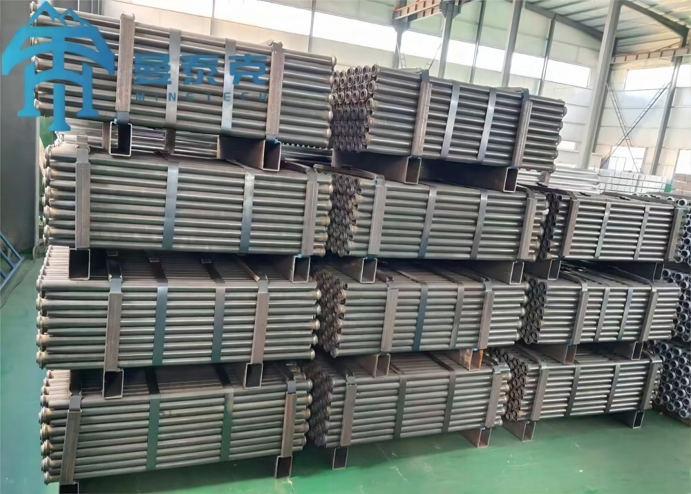 For secure and efficient handling, friction bolts are bundled together and systematically stacked on wooden pallets for shipment and storage.